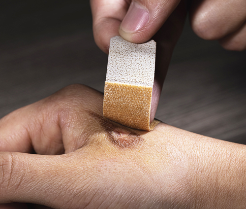 选取合适的规格,打开包装,取出创口贴,撕开隔离纸,将中间吸水垫对准创伤处,使胶层粘贴在皮肤上,用手轻轻按实固定即可。